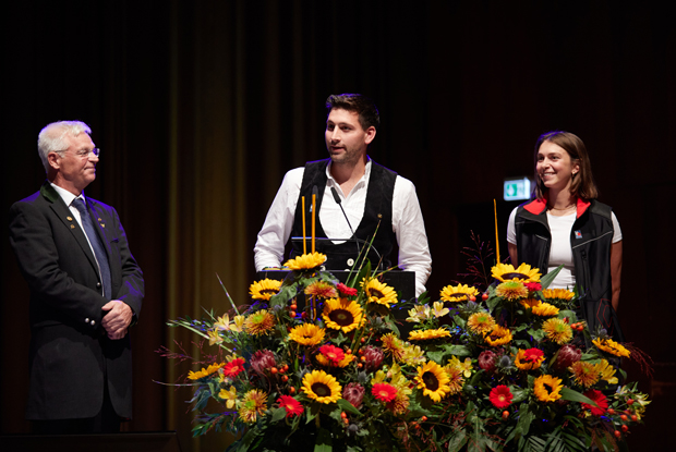 Verbandspräsident Peter Aicher (l.) führte durch den Festabend und begrüßte dabei u.a. die Gesichter der Messe DACH+HOLZ 2024: Zimmermeister Stephan Pöschl und Spenglermeisterin Jennifer Konsek.
