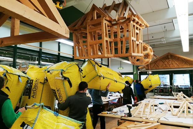Die Praxistauglichkeit wurde mehrfach getestet - vom Obermeister der Zimmerer-Innung Oberland Michael Andrä und weiteren Azubis im 3. Lehrjahr der Klasse BZ 12a. Zunächst pumpten sie die Kissen mit einem Gebläse auf, pro Luftsack dauert das rund 30 Sekunden.