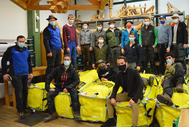 Gruppenfoto auf Luftkissen: Die Zimmerer-Azubis der BZ 12a und vorne (v.l.) ÜBA-Ausbilder Anton Höck, Obermeister Michael Andrä und Geschäftsführer Roland Streim.