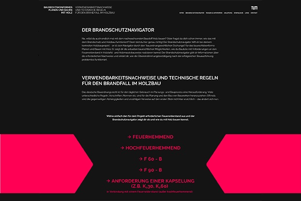 Holzbauprojekte erfordern besondere Kenntnisse im Brandschutz. Mit dem Brandschutznavigator werden wir unseren Mitgliedsbetrieben ein Online-Tool zur Verfügung stellen, dass Planer durch die baurechtskonformen Möglichkeiten des Holzbaus führt. Entwickelt auf Basis umfangreicher Forschung an der Technischen Universität München, informiert das Tool über Feuerwiderstand, erforderliche Nachweise und die Übereinstimmungsbestätigung nach Bauabschluss.