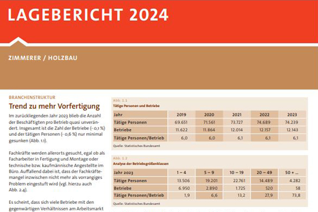 Die Daten und Fakten zur Branchenentwicklung basieren unter anderem auf den Aussagen und Prognosen für das Zimmerer- und Holzbaugewerbe aus der Konjunkturumfrage von Holzbau Deutschland. Zum Jahreswechsel 2023/2024 haben sich rund 360 Unternehmer:innen des Holzbau- und Zimmerergewerbes daran beteiligt. Darüber hinaus fließen Erkenntnisse aus dem Betriebsvergleich sowie Datenmaterial des Statistischen Bundesamtes in die Erstellung des Lageberichts ein.