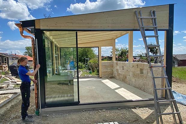 Kathi Schmid (21) trägt Zimmerer-Kluft und verschraubt eine Holzständerwand – neben ihr stehen Mikrofon und Filmkamera. Denn am 7. Juli 2021 drehte der Bayerische Rundfunk einen Beitrag über die drei Zimmerinnen und Cousinen Elisabeth (19), Kathi und Sabrina (19) Schmid aus Landsberger Innungsbetrieben.