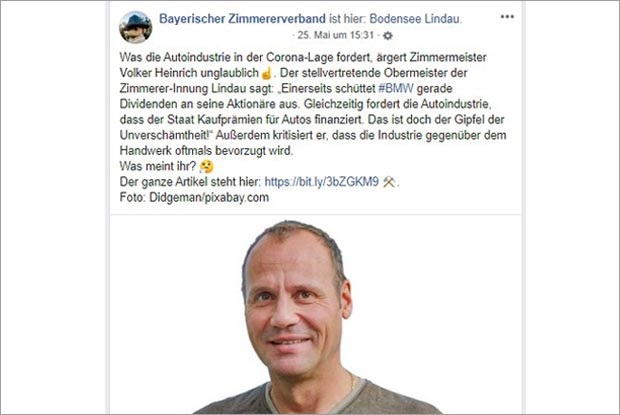 Mit so viel Rückenwind hätte der stellvertretende Obermeister der Zimmerer-Innung Lindau Volker Heinrich nicht gerechnet. Vor kurzem hat er kritisiert, dass die Autoindustrie staatliche Kauprämien fordert. In den sozialen Medien bekam er dafür viel Zuspruch. In Zukunft will er sich als Gemeinderat für klimafreundliche Konjunkturmaßnahmen einsetzen.