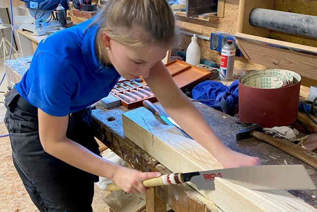 Nach dem Abitur wollte Charlotte Kleemann (19) Architektur studieren. Doch sie entschied sich für eine Zimmererlehre im Innungsbetrieb Max Kiener Zimmerei GmbH in Emmering (Landkr. Fürstenfeldbruck). Mittlerweile ist sie im 3. Lehrjahr und bereut ihre Entscheidung nicht – im Gegenteil.
